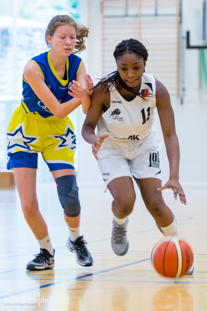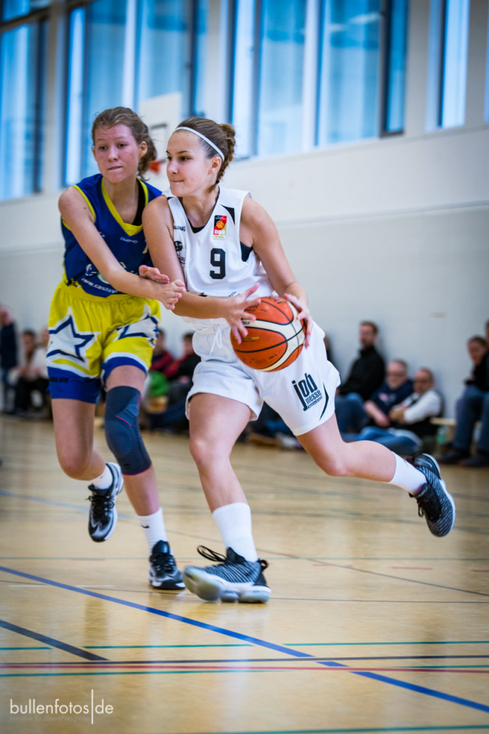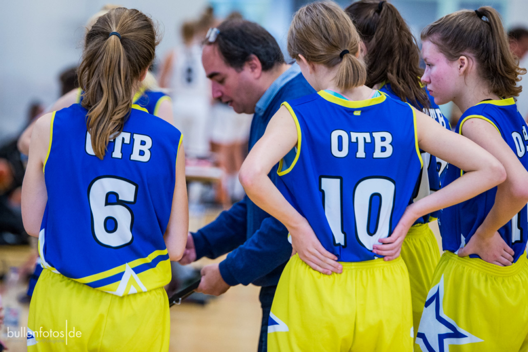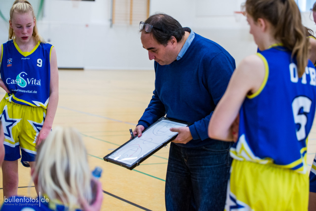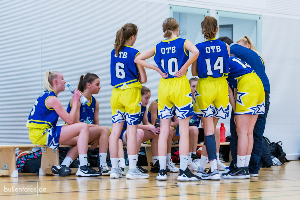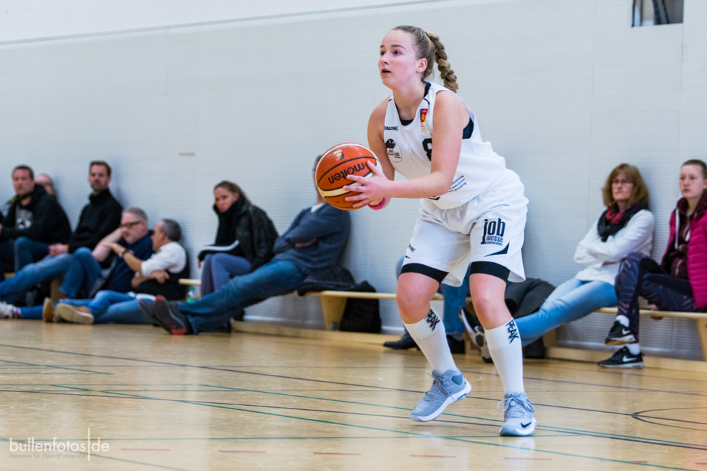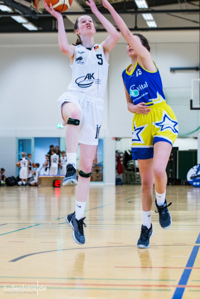 Danach wechselte das Trainerteam Jörg Scherz und Maya Girmann gleich fünf Spielerinnen auf einmal und zog die Defense ins Halbfeld zurück. „Keine gute Idee!“, musste Headcoach Scherz nach dem Spiel attestieren. Die eingewechselten fünf Spielerinnen kamen mit der Halbfelddefense nicht zurecht und erzielten bis zur Viertelpause keinen Korb mehr (19:10). Doch dann „schüttelte“ Scherz seine Truppe einmal kräftig durch, wechselte klüger und es folgte ein „Glanzviertel in der Offense“ (29:12), sodass sich schon zur Pause der Sieg abzeichnete. Im weiteren Verlauf des Spieles präsentierte sich Charlotte Kreuzhermes (20) wieder einmal als zuverlässigste Punktesammlerin, Akosua Asare (8) bewies ihre defensiven und offensiven Qualitäten und Mona Landwehr (10/1), die für das abendliche Damenspiel etwas geschont wurde, „bettelte“ förmlich mehr spielen zu dürfen. Sarah Egbert (3/1), Lotta Millich (5), Nora Horvath (8) und Stina Weber (6) zeigten in der 2. Halbzeit ihre Stärken und sorgten im 3. Viertel für eine mannschaftlich geschlossene Leistung (23:3). Leider mussten die beiden leicht verletzt ins Spiel gegangenen Leyla Berisha und Mareike Schulz (2) schon im 2. Viertel einsehen, dass ein weiterer Einsatz nicht möglich war. Malin Kindermann bekam nach ihren guten Leistungen in den letzten Wochen keinen guten Zugriff auf ihr Spiel, was sie aber mit einer Kampfansage für das sonntägliche U18-Spiel verband, worüber sich die Trainer besonders freuten.